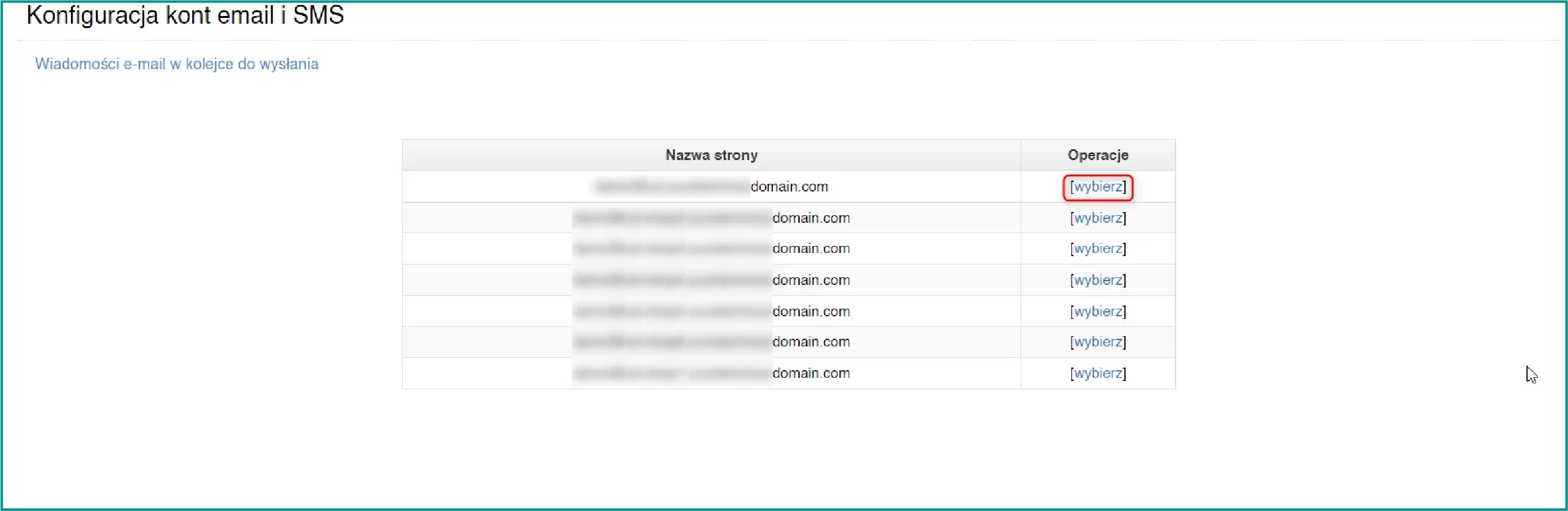 3. W widoku **"Konfiguracja kont email i SMS"** znajdź domenę, dla której chcesz ustawić serwer SMTP, i kliknij opcję **"wybierz"** przy tej domenie.<br>