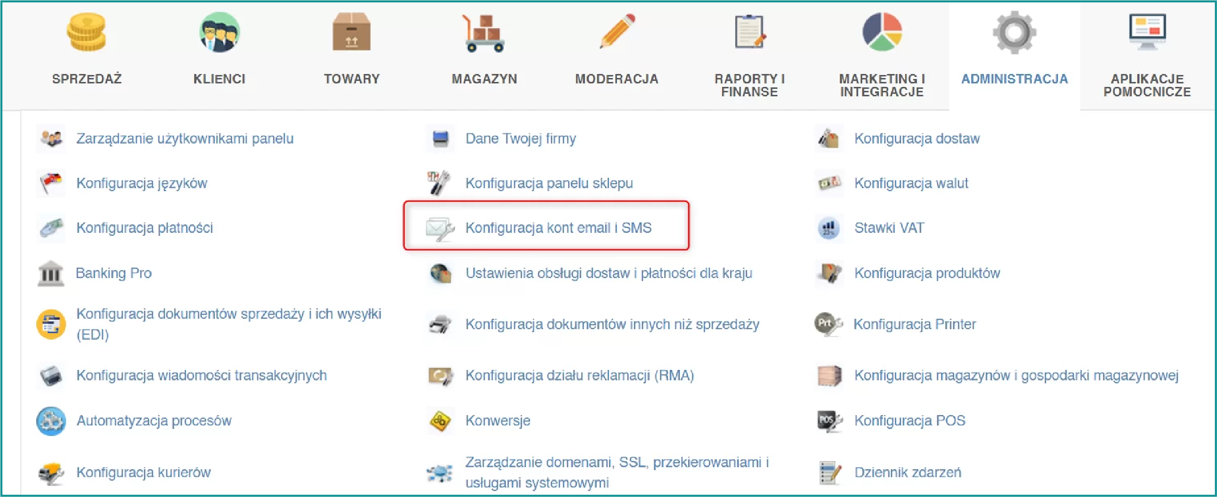 2. W menu głównym wybierz **"ADMINISTRACJA"**, a następnie **"Konfiguracja kont email i SMS"**.<br>